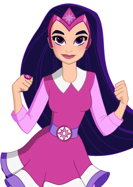 Star Sapphire has light colored skin, with long dark blackish purple hair and purple eyes. She wears a tiara with a crystal star in the middle over her head, a magenta pink top with white and purple trimming, white collar and pink sleeves, she also wears a magenta pink skirt with a white and purple trim at the bottom, attached by a purple belt with a white circle with a pink outline and a pink star in the middle, she also wears pink leggings to match her sleeves and purple boots.